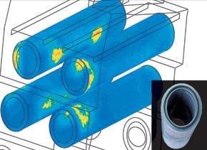 先進(jìn)的FLUENT軟件模擬流體動(dòng)力學(xué),結(jié)構(gòu)力學(xué)和聲學(xué)分別模擬了DFO型號(hào)1-1,2-2,3-3的性能等級(jí)。而下面(左圖)顯示了利用FLUENT軟件作流量測(cè)試,從而令DFO 3-3內(nèi)部的氣流速度更均勻分布。另外下右圖顯示了利用ANSYS®*結(jié)構(gòu)分析軟件測(cè)試DFO 3-3,在正常工作壓下之內(nèi)部壓力分布測(cè)試。