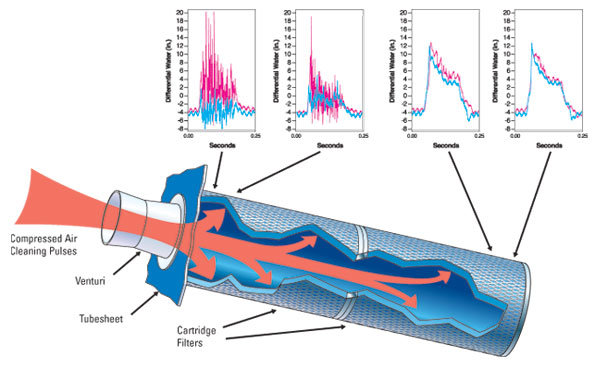 ExtraLife脈沖清灰系統(tǒng)采用專(zhuān)有的模擬脈沖清灰技術(shù)來(lái)設(shè)計(jì),令粉塵可以輕松地從濾筒表面吹掉,從而提高過(guò)濾效率,延長(zhǎng)濾材的使用壽命。圖中紅色曲線(xiàn)顯示ExtraLife系統(tǒng)在DFO前排濾筒產(chǎn)生的壓力增加。而藍(lán)色曲線(xiàn)則表示普通濾筒的脈沖反吹表現(xiàn)。